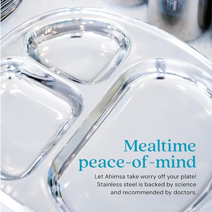 - 𝐏𝐞𝐝𝐢𝐚𝐭𝐫𝐢𝐚𝐧 𝐃𝐞𝐬𝐢𝐠𝐧𝐞𝐝 𝐰𝐢𝐭𝐡 𝐅𝐨𝐨𝐝-𝐒𝐚𝐟𝐞 𝟑𝟎𝟒 𝟏𝟖/𝟖 𝐒𝐭𝐚𝐢𝐧𝐥𝐞𝐬𝐬 𝐒𝐭𝐞𝐞𝐥: Ahimsa Balanced Bites stainless steel kids plates are thoughtfully designed for kids’ health and safety. Our toddler plates with dividers are crafted from high-quality food-safe 304 18/8 stainless steel to prevent chemical transfer and eliminate soapy aftertastes. Our toddler stainless steel plate makes safe eating simple and joyful