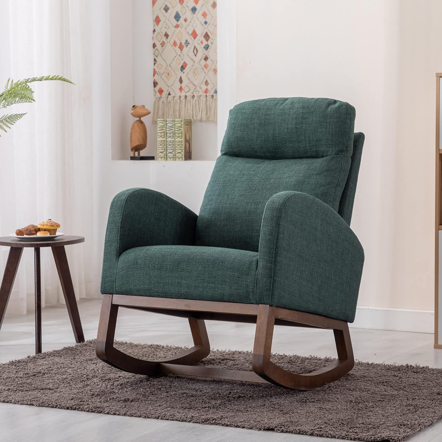 Dolonm Nursery Rocking Chair for Living Room, Upholstered Mid-Century Modern Nursery Rocking Armchair Tall Back Accent Glider Rocker, Emerald