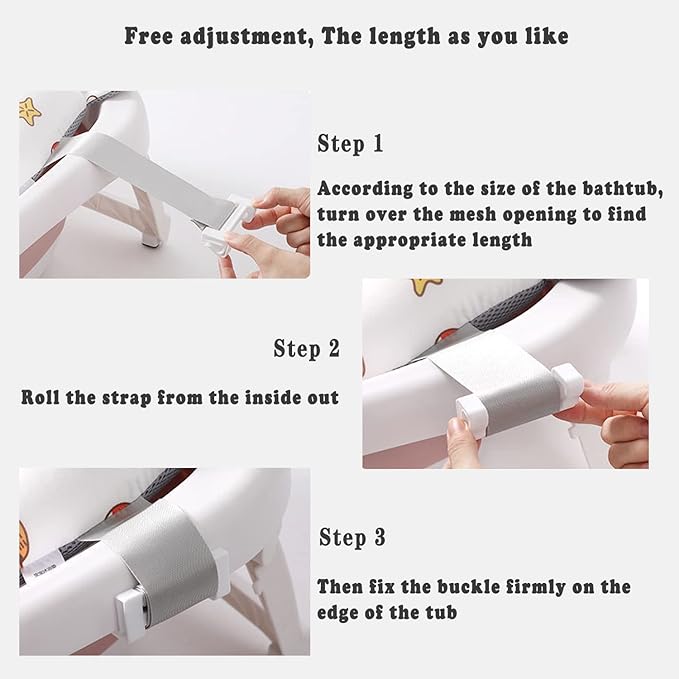 - 【3 Directions Adjustable Buckle】Three directions buckle safely fixed belt can be firmly fixed to any edge shape of the bathtub.The solid durable buckle can adjust the shower pad height to keep balance, prevent your baby from slipping off and choking on water. Suitable for most normal bathtubs.