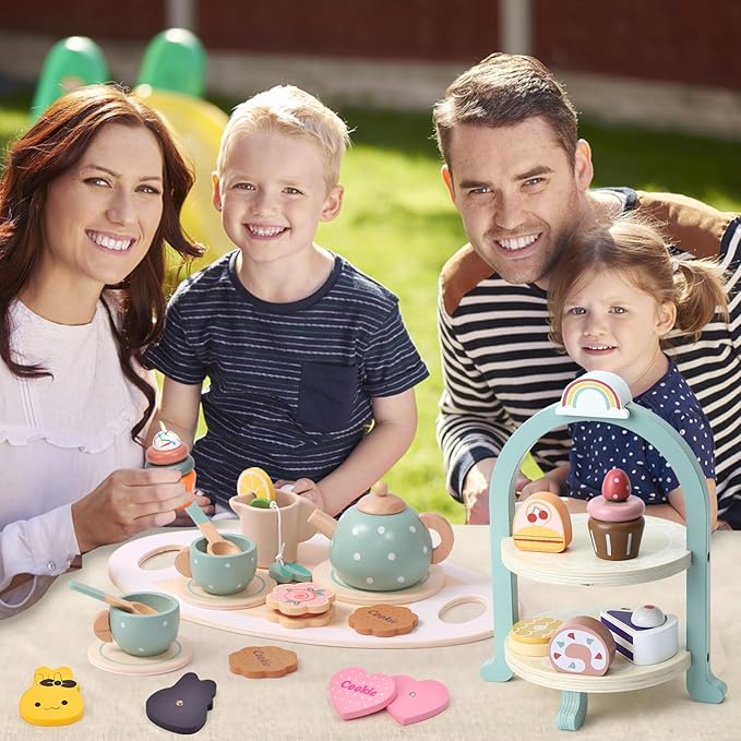 - Fun Kids Tea Party Time: Your little kid gets ready to spend happy teatime with friends and family, dessert, drinks, and talk! Lay out the tablecloth, fill the dessert tower and tray with a delicious dessert, put the tea or coffee in the cup, and start tea time! The realistic wooden tea set will bring screen-free fun and leave unforgettable memories for children