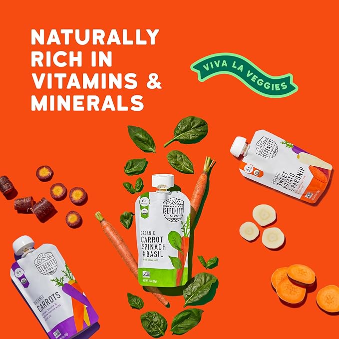 Serenity Kids 6+ Months Certified Organic Baby Food Pouches Veggie Puree - No Sugary Fruits/Added Sugar - 3.5 Oz BPA & Allergen-Free Packaging - Garden Variety Pack - 6 Count Veggie Puree Pouches