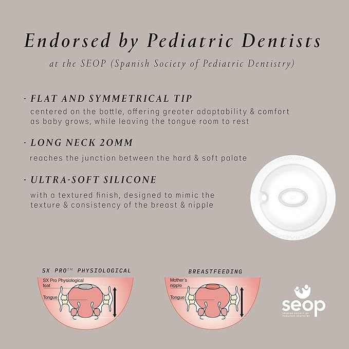 - SX Pro Physiological nipple made from 100% silicone with anti-colic valve. SX Pro nipple is designed to help the tongue remain in the same natural position as when the baby is breast feeding, aiding in correct positioning of the mouth, tongue & jaw.