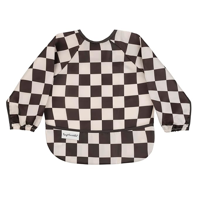 Tiny Twinkle Long Sleeve Bib for Babies & Toddlers – Waterproof Smock Bib for Eating – Machine Washable & Mess-Proof, Baby Feeding Essential & Shower Must-Have(Checkers Black, 6–24M)