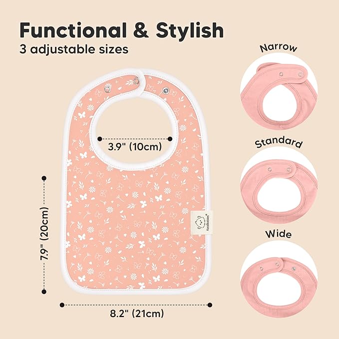 - 3 Adjustable Sizes With Soft Seams - With 2 sets of nickel-free snaps, you can adjust the girl and boy bibs according to your baby’s neckline. The soft-wrapped seams provide extra comfort for your baby while having the baby cloth bibs on.