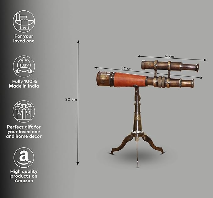 - Telescope Size :- 27 Cm & 16 Cm|Color :- Black Finish|Material Used :- Solid Brass|Total Height :- 30 Cm approx. This classic solid brass harbor master telescope on mahogany tripod has excellent optics for viewing far away objects such as approaching ships