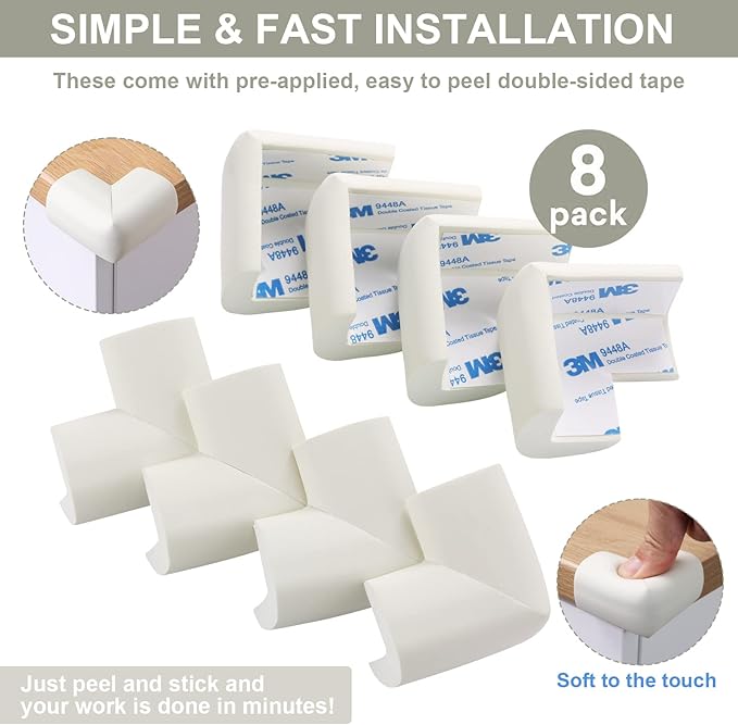 - Safety Corners For Furniture :Use our child proof corner guard on sharp corners in your home to prevent any accidental scrapes from your child running into corners. Our Childproof Corner Protectors will stick to nearly any surface using long-lasting double sided tape. Use them on wood, glass, steel, and ceramic surfaces to baby-proof your home today