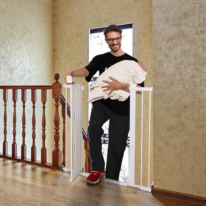 - EASY & SAFETY LOCK: The baby gate is easy to install on the wall, and it has a walk-in door with double lock lever handles, allowing adults to easily unlock and lift the baby gate with one hand but it is difficult for babies. It is very suitable for stairways or doorways