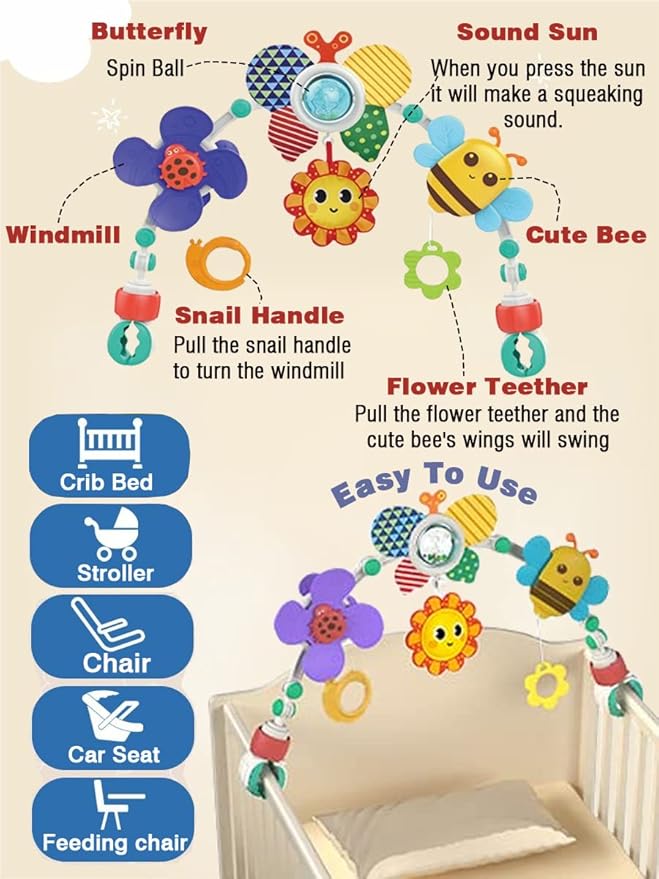- Carseat toys for infants 0-6 months,Stroller toys have variety of graphics,Ladybug Windmill.Flower teether.Snail.Cute Bee.Bullt-in BB squeaker in the sun,press to make a Bi~ Bi~ sound.Butterfly colorful rotating ball rattle.