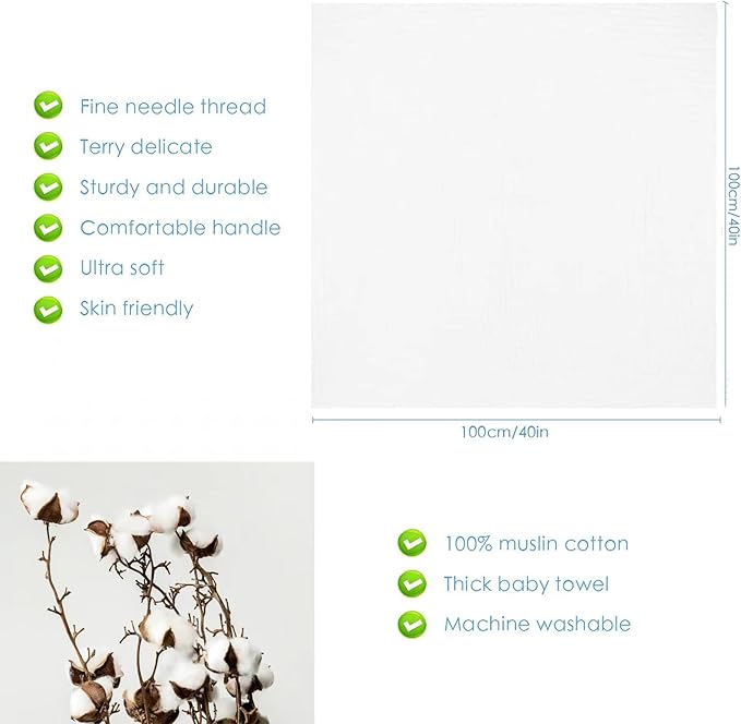 - [Easy Care] Our baby muslin towels are high quality enough for everyday use.Infant muslin towel will keep softness and thickness after wash.Baby comforting towel for newborn bath is machine washable and quick dry.Soft baby towels cotton are very easy to clean