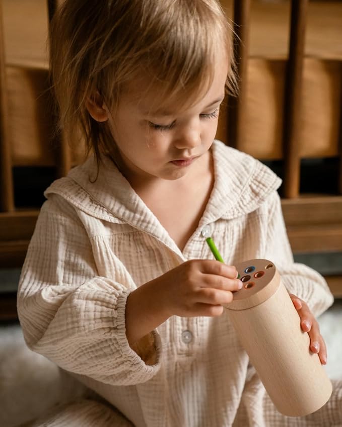 - Montessori Inspired Educational Toy: During the toddler years, kids go through a ”posting” phase where they LOVE sticking objects through slots or holes… it fascinates them! They could spend hours doing this one simple activity! This Montessori posting toy was designed for little ones to be able to retrieve the sticks easily and independently with a secure, rotating top!