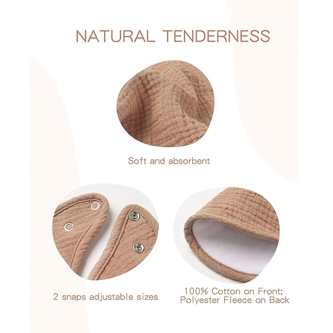 - Soft and Absorbent: The front of baby bibs are made of 100% cotton(Muslin) and the back are polyester(comfort fleece) for maximum absorption with skin-friendly soft touch. The bib soaks up all drools and spits to keep you and your baby clean and dry, no more wet clothes