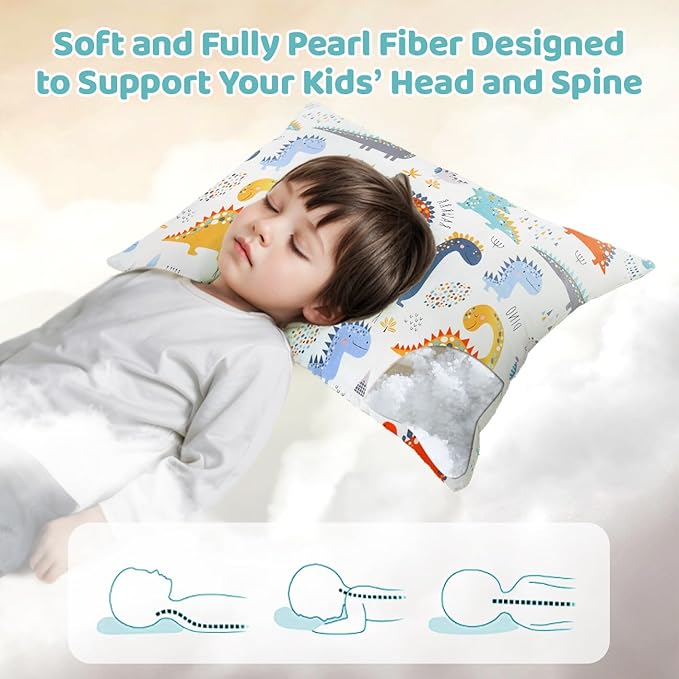 LOFE Organic Plilow with Cartoon Pillowcase - 16x22 Kids Pillow with 100% Organic Cotton Shell, Adjustable Organic Youth Pillow, Machine Washable, Soft,for Kids&Youth&Children (Dinosaur)