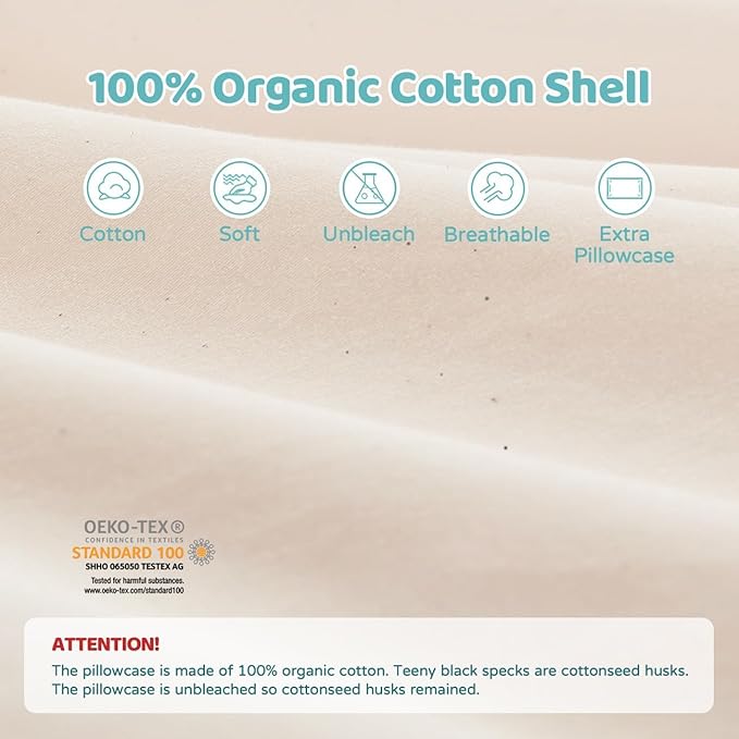 - đ„WHY WE CHOOSE 100% ORGANIC COTTON SHELL - It's handmade with 100% organic cotton shell with soft poly cluster fiber filling. The fabric is unbleached and friendly to your kids' skin. When you get the organic pillow, you can see the tan color of this kids pillow because there is no bleaching process. And you will not find any funny smell when you get the organic pillow.