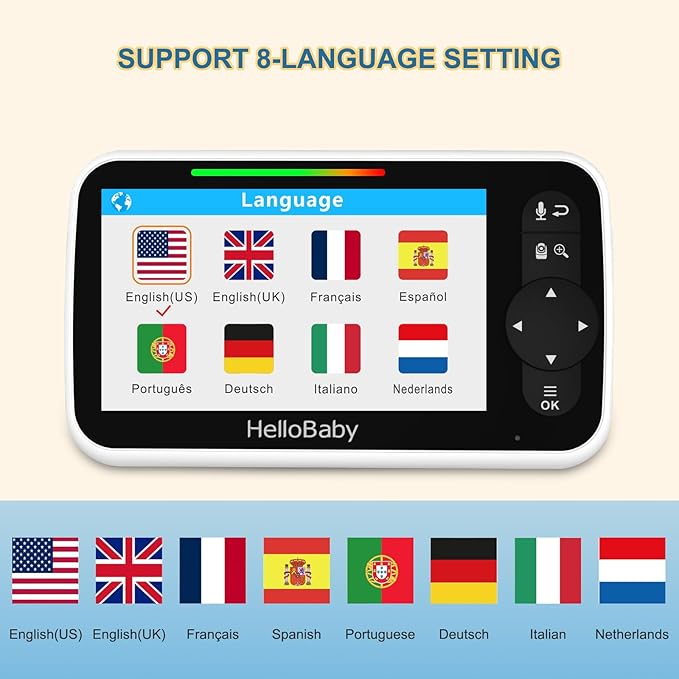 HelloBaby 5 Inch Video Baby Monitor with Camera and Audio, Remote Pan-Tilt-Zoom Camera with Night Vision, 2-Way Talk, Temperature, 8 Lullabies and 1000ft Range Baby Monitor No WiFi Needed