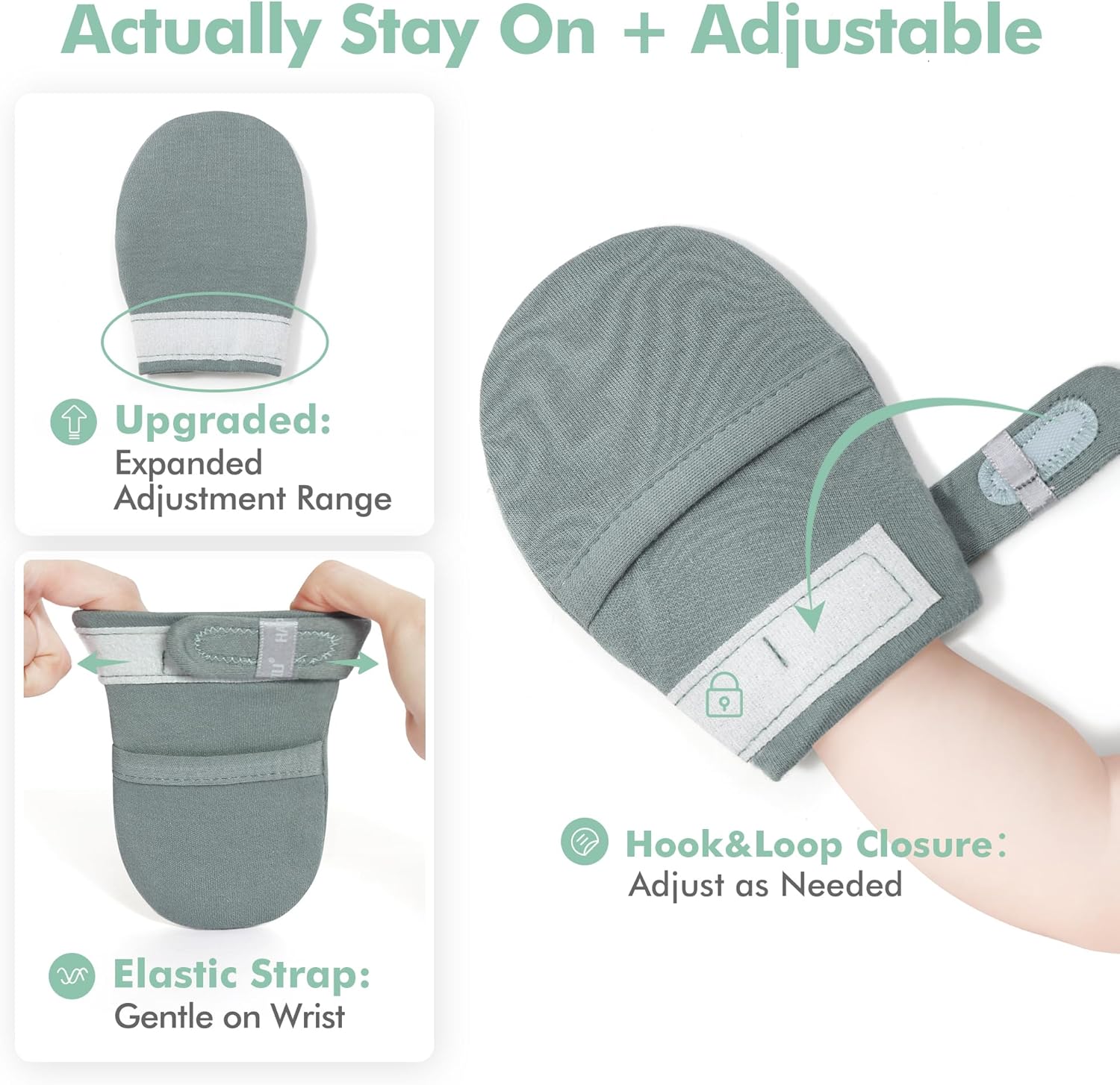 HAPIU Baby No Scratch Mittens Stay On, 100% Cotton Breathable, Adjustable Infant Gloves for Boys Girls, Newborn - 12 M