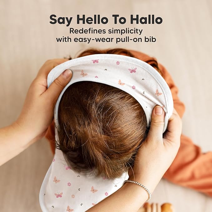 - For Active Infants, Toddlers - The Hallo Baby Teething Bib features a pullover lap shoulder design—no snaps, easy to put on. Just slip it over the baby's head like a t-shirt, and you’re all set. It stays on all day, even for the most active toddler.