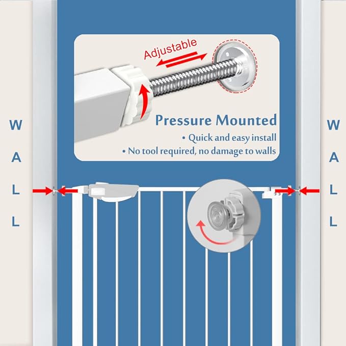 - [Easy Installation] Pressure mount installation enables easy assembly and disassembly, no tools required, no need for drilling holes, and no damage to the wall of your house. Please note: before installation there will be a gap between the latch and frame. This is NOT a defect. The gap will become narrower after proper installation. Do NOT cut the tie that holds the door to the gate before installation is complete.