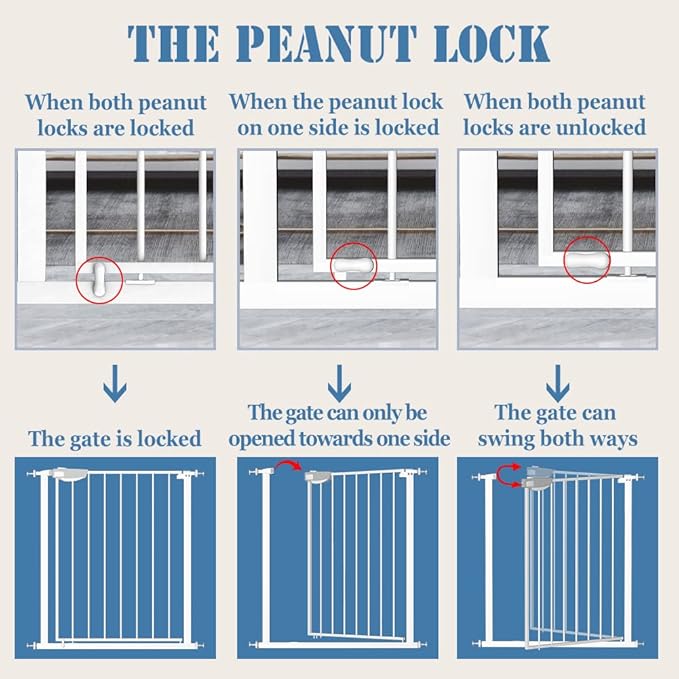 - [Safe Triple Lock] Child Safety Gate Baby Gates have triple safety lock design. At the top of the gate, there are two buttons on the handle and each of them controls one lock. To open the gate, you need to press both buttons simultaneously. Adults can easily open the gate with one hand, while the two-action handle remains tough for babies to release and open. At the bottom of the gate, there is a peanut lock on each side to control the opening direction and locking.