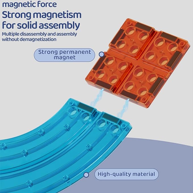 - đăCHILD BRAIN DEVELOPMENTă: Our race car track building block kit promotes problem-solving skills, hand-eye coordination, and trains fine motor skills. The magnetic tiles feature quick-connect magnetized edges that allow children to easily engineer architectural structures and designs using the laws of physics and the power of magnets. Watch as they create multi-layer 3D race tracks that the cars can go up and down on.