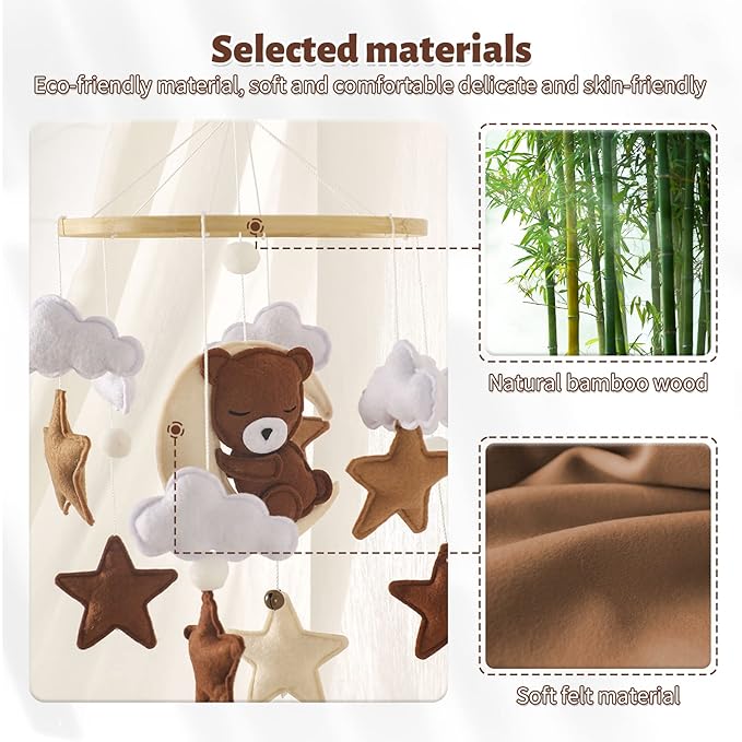 - Good Material: Our handmade bear baby crib mobile for girls and boys is made of soft felt and wood, which is safe and durable. Baby will be soft and comfortable touching the animal decoration