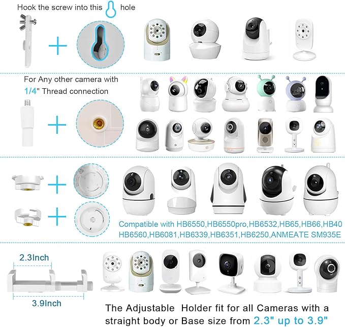 - Fit for most Baby monitor Camera:Compatible with Infant Optics DXR-8 / DXR-8 Pro ,Eufy Baby Monitor/HelloBaby HB65 HB66 HB248, ANMEATE SM935E Baby Motorola ,Arlo ,Owlet, Vtech Nanit Baby Monitor Camera and any baby monitor camera with 1/4 threaded hole .(NOTE:The Baby monitor is not included)