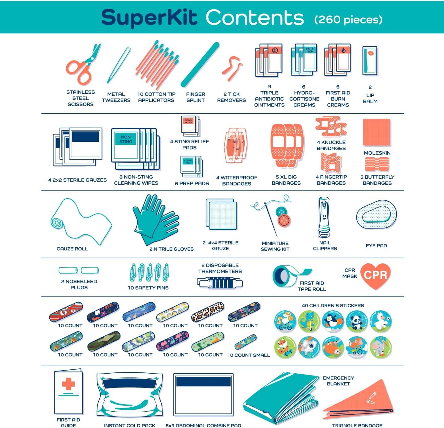 - All You Need – Good things come in complete packages! Your large first aid kit has 260 pieces of essential first aid supplies for every ouchie. From burn relief to bandages, you’ll be ready for anything.