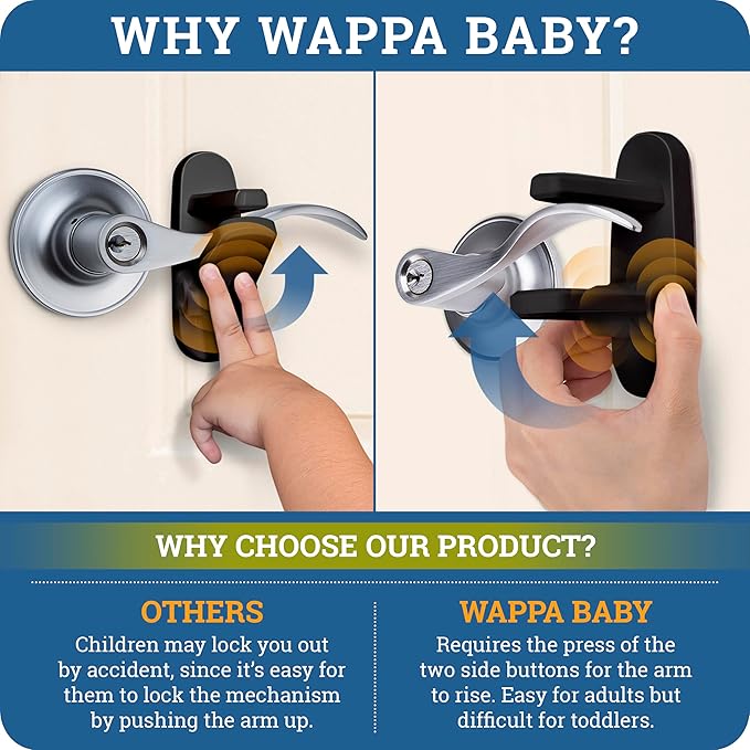 Door Lever Lock (2 Pack) Prevents Toddlers from Opening Doors. 3.25" L * 1.5" W * 4.5" H Easy One Hand Operation for Adults. Durable ABS with 3M Adhesive Backing. Simple Install, Black