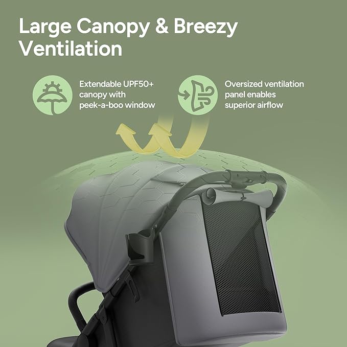 - Large Canopy & Breezy Ventilation - Enjoy total protection with an extra-large UPF 50+ sun canopy. For warmer climates, the backrest intelligently transforms into an extra-large ventilation panel, providing both a panoramic view and superior airflow. This system, complemented by a silent magnetic peek-a-boo window, ensures your child remains cool and comfortable while staying connected to you and their surroundings. From scorching sun to a gentle breeze, your baby travels in protected comfort.