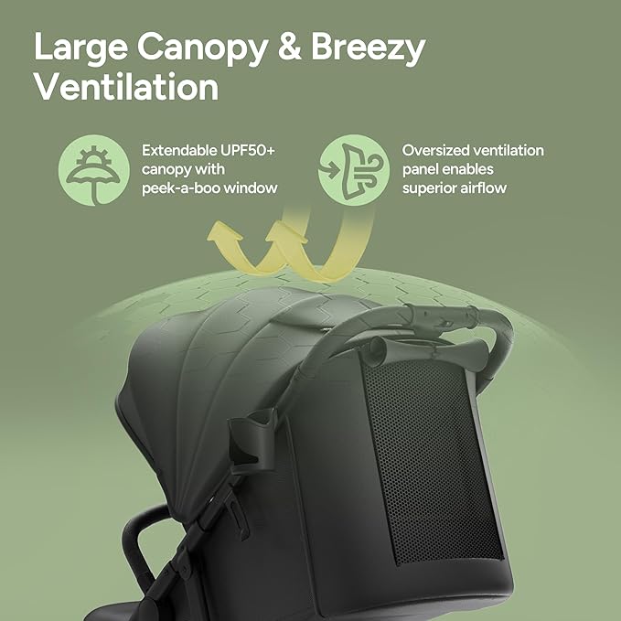 - Large Canopy & Breezy Ventilation - Enjoy total protection with an extra-large UPF 50+ sun canopy. For warmer climates, the backrest intelligently transforms into an extra-large ventilation panel, providing both a panoramic view and superior airflow. This system, complemented by a silent magnetic peek-a-boo window, ensures your child remains cool and comfortable while staying connected to you and their surroundings. From scorching sun to a gentle breeze, your baby travels in protected comfort.