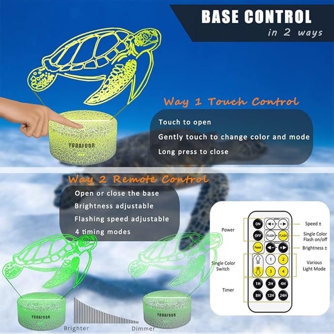 - Smart Touch and Remote Control-You can turn on 7 color changing ocean sea turtle night lights by touching the buttons on the base or using the remote control. According to personal preferences, one color can be fixed or 7 colors can flicker alternately. 2 power supply methods, 3 X AA battery not included or USB connection, convenient to use. The light source use the high quality LED, soft and uniform, no dazzling, non flicker, eye protection