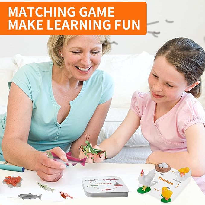 - Life Cycle Matching Card Set: Contains 6 Sets of Plastic Animals Including Turtle, Chicken, Ant, Plant, Mantis, Salmon.
