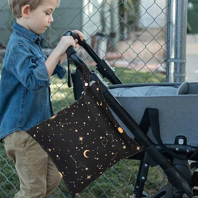 - 2 ZIPPERED POCKETS & HANDLE DESIGN: The 2 pack cloth diaper bags are designed with 2 Zippered compartments to keep wet and dry clothes separately, or separate dirty and clean diapers. There's a handle with a button on one side for hanging up, convenient to carry and attach to your stroller, doorknob, towel rack, hook or handbag.