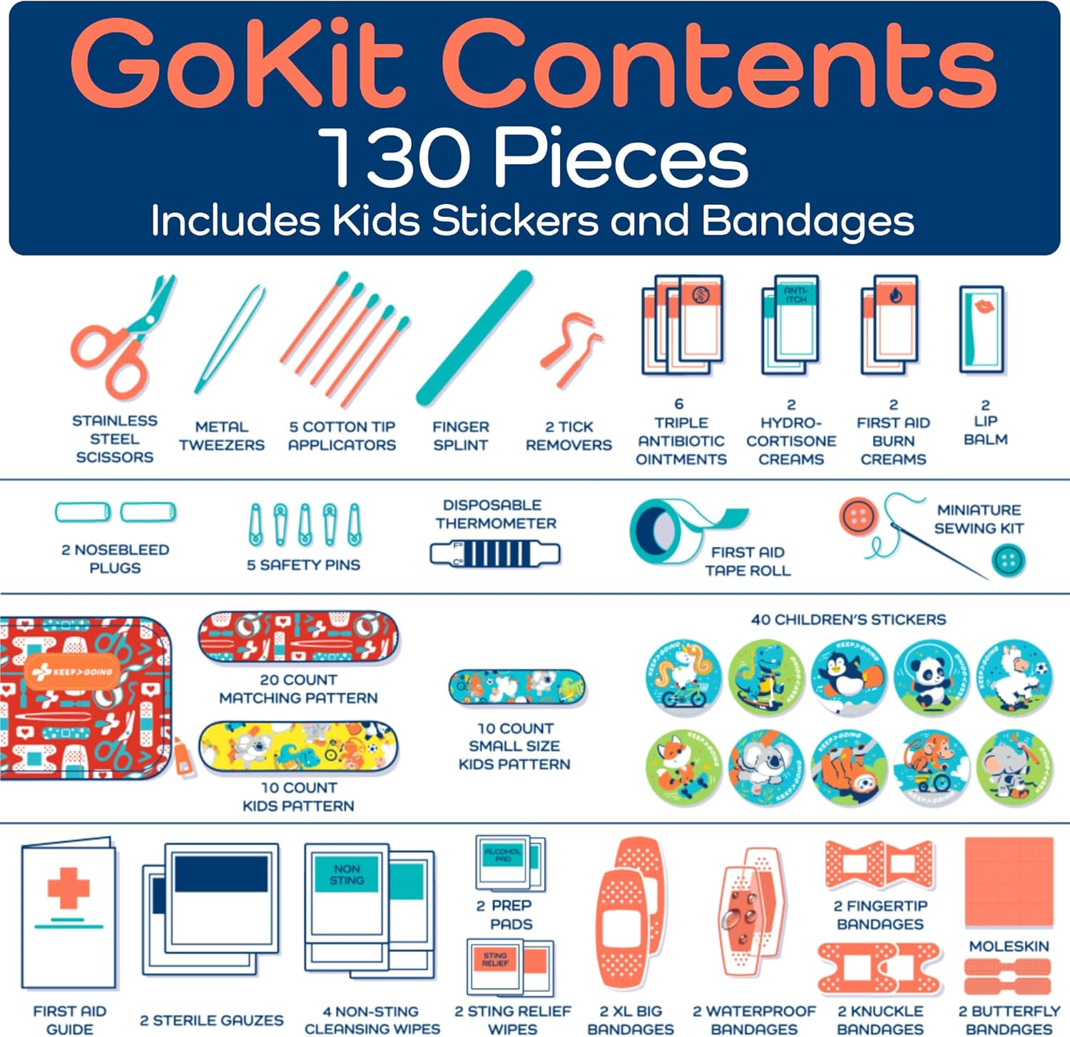 - For Your Family – The average med kit is designed just for adults, but your KEEP>GOING kit works perfectly as a baby first aid kit and beyond. Bandage their boo-boos and put smiles back on their faces!