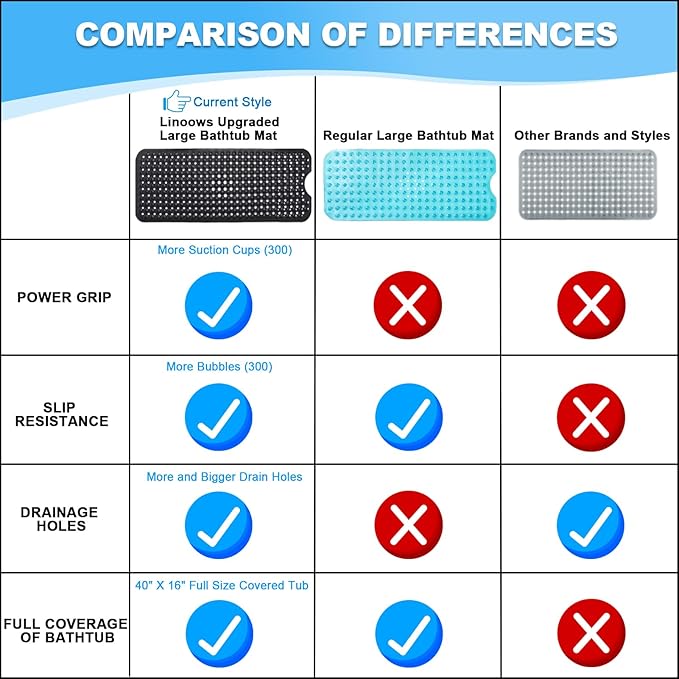 - STRONG GRIP: Linoows premium tub and shower mat upgrade comes with 300 high-strength and flexible suction cups, 30% more suction cups than other ordinary tub mats on the market, and stronger suction to help keep it in place on a smooth clean surface. Our bath mats are a great choice for the home, gym, spa, and more!