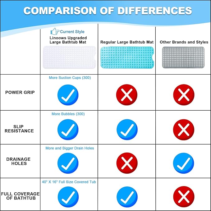 - STRONG GRIP: Linoows premium tub and shower mat upgrade comes with 300 high-strength and flexible suction cups, 30% more suction cups than other ordinary tub mats on the market, and stronger suction to help keep it in place on a smooth clean surface. Our bath mats are a great choice for the home, gym, spa, and more!