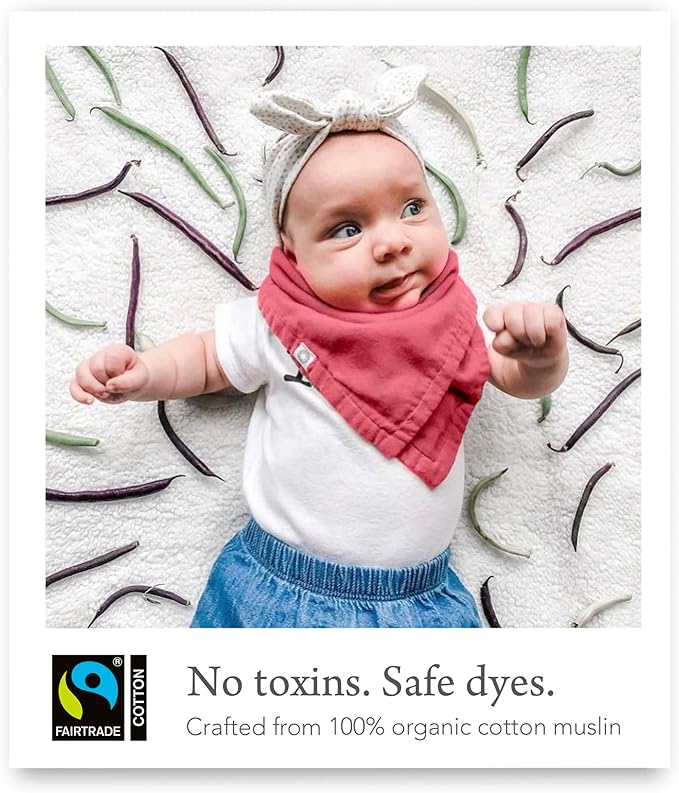 - 100% ORGANIC COTTON MUSLIN, FAIRTRADE CERTIFIED – Every bib is made from Fairtrade-certified organic cotton muslin, supporting better wages, safer working conditions, and dignity for the people who make them. No toxins. No harsh dyes. Just softness with real substance.
