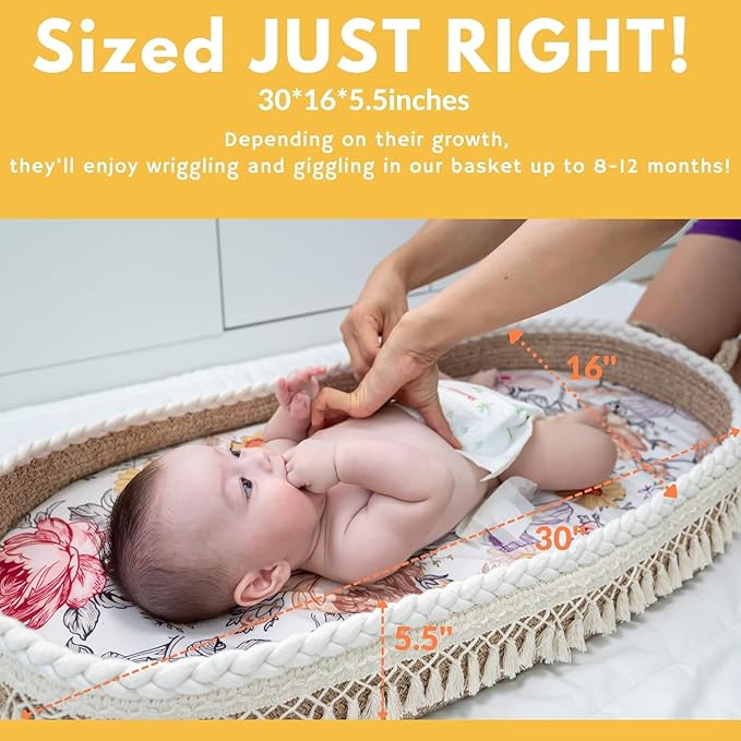 - ✔ STYLISH AND CLASSY : Our Baby Changing Basket Station With Boho Baskets for Baby Nursery Design And Delicate Flower Print On The Cover. As A Thank You For Trusting Us With Our Diaper Changing Basket for Baby Dresser, We will Also Include An Eco-Friendly, 100% Cotton Carrier Bag For Your Basket. Macrame Tassels Around The Edges And A Boho Natural Look Changing Basket for Baby will Look Stylish In Any Room Of The House with this Baby Furniture.