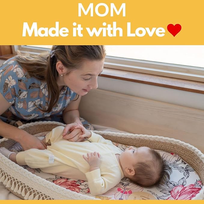 Baby Changing Basket Set with Diaper Caddy Organizer Macrame Boho Moses Basket for Babies, Handmade 100% Cotton Rope, Woven Portable Nursery Decor Waterproof Pad & Floral Pad