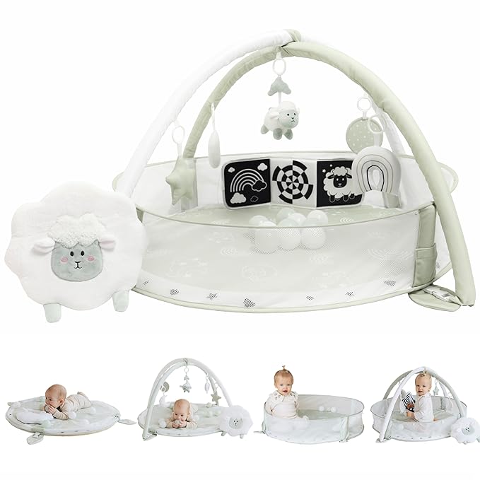 - š¼ {Adaptable} This versatile baby playmat encompasses 6 different uses: tummy time mat, baby activity center, pop up mesh fence, high contrast book, ball pit with balls included and lamb storage bag. Engineered to align with your baby's developmental stages, this mat will capture your baby's attention providing hours of both entertainment and learning. Caution: Always ensure adult supervision during use.