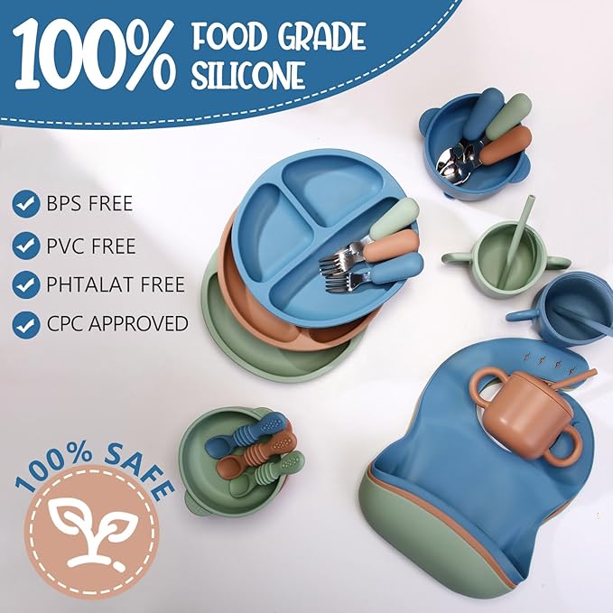 - Silicone Baby Feeding Set: the package comes with 24 sets of silicone baby feeding set in 3 different colors of dark green, dark blue, walnut color, 8 pieces per set, and each set contains a suction divided plate, a pair of spoons and forks, an adjustable silicone bib, a complementary food bowl, a snack cup, a silicone spoon, and a straw, which covers the basic utensils for baby food, helping your baby transition to self eating