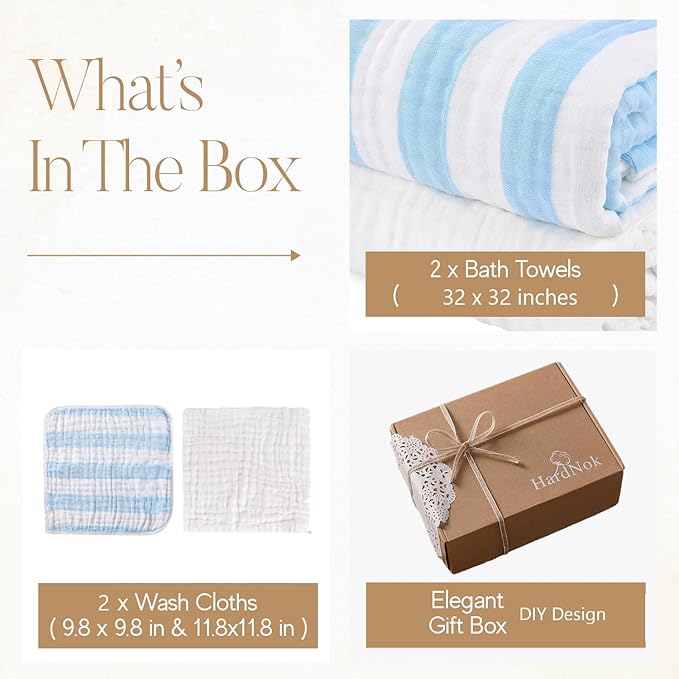 - 【Suitable for Newborn and Toddler】Our Muslin Hooded towel is Large Size 32 inches x 32 inches,Baby washcloths is 11 x 11 inches, Use it as a bath towel, beach towel, swaddle Blanket, Play Mat, Stroller Cover, very convenient and lightweight whether you are traveling or staying at home