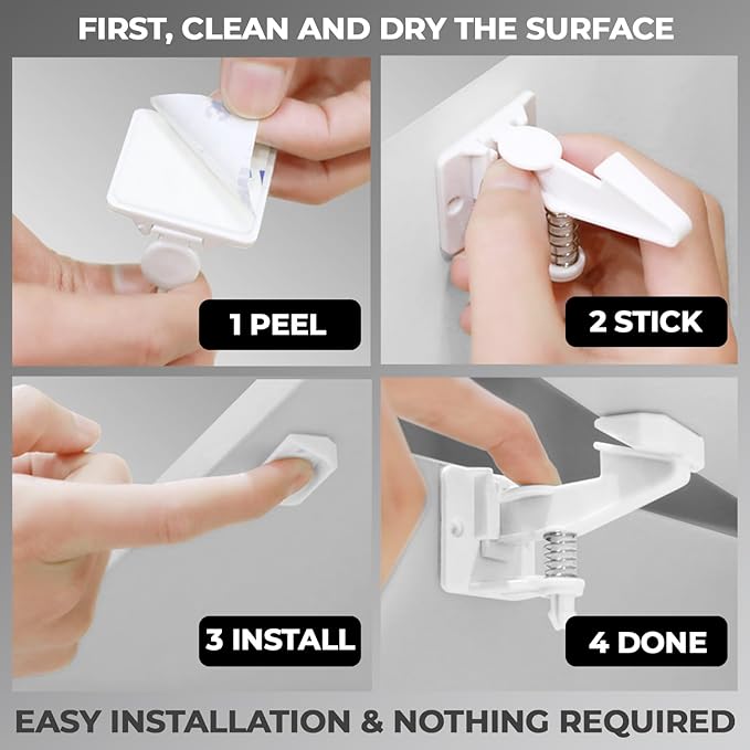 - Easy to install: Stick our childproof cabinet latches on without tools. Thanks to strong 3M adhesive, these baby drawer locks, childproof cabinet latches securely hold in place