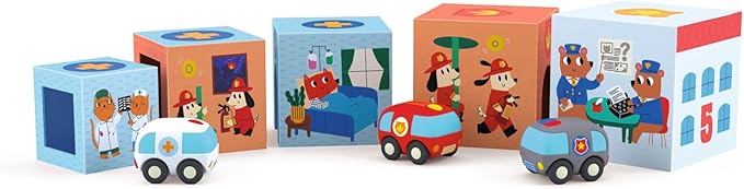 - 5 illustrated blocks housing 3 vehicles to play with and build a lovely town.