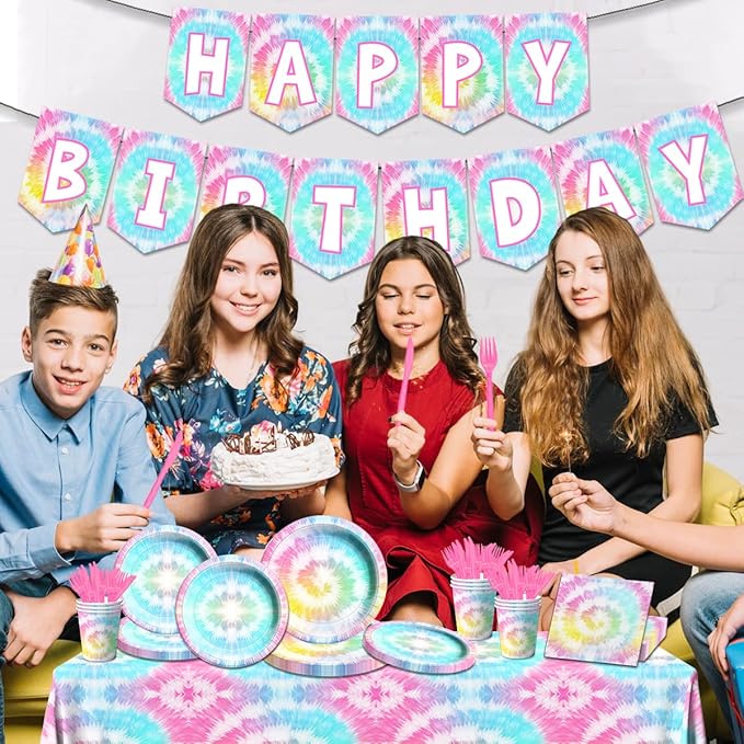 142Pcs Tie Dye Birthday Party Decorations,Colorful Birthday Party Supplies Tableware Includes Tie Dye Plates and Napkins,Cups,Tablecloth,Happy birthday Banner, Serve 20