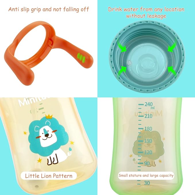 - 【Easy to Clean & Easy to Grip】Many parts are detachable and interchangeable , and they're all quite easy to clean and mold-free. Also the cups with handles or grippy material that’s easy for little hands to pick up. The cup has a soft silicone spout that has a special vent to prevent swallowing too much air. If the seal ring does not fit, try using 2 cotton swabs to assist with the fitting.