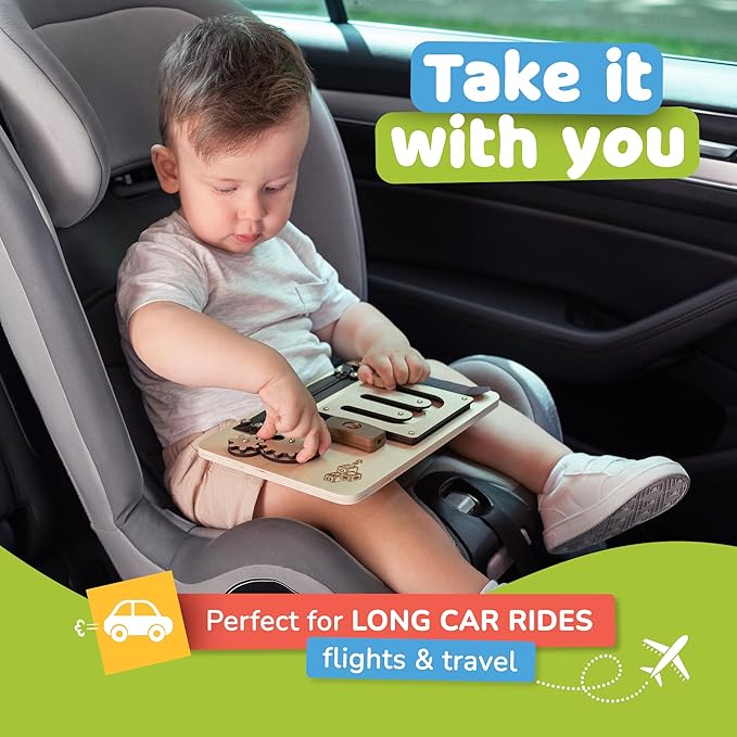 - Kids Travel Toy - This lightweight and portable busy board keeps little ones entertained with engaging sensory activities. Perfect for toddler plane activities and road trips, this montessori toy is a great addition to kids travel essentials. Ideal as airplane toys for toddlers, it provides screen-free fun.