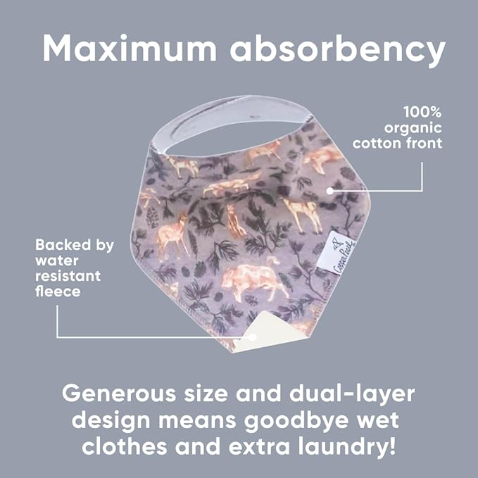 - MAXIMUM ABSORPTION: Fronted by ultra-soft Organic Cotton and lined with water-resistant polyester fleece to provide an extra layer of absorbency. Each bib is crafted with dual-layer protection against heavy drooling or spit-up, keeping your baby dry and comfortable.