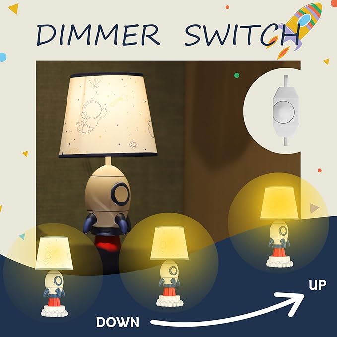 - 【Exquisite Fade Resistant Fabric Lamp Shade】Still looking for rocket light room decoration for boys’ bedroom? The adorable shade of this Rocket Table Lamp for Boys' Bedroom is designed to turn heads. Features fade-resistant fabric exterior and durable PVC lining. Exquisite edge banding and rust-proof UNO shade construction.