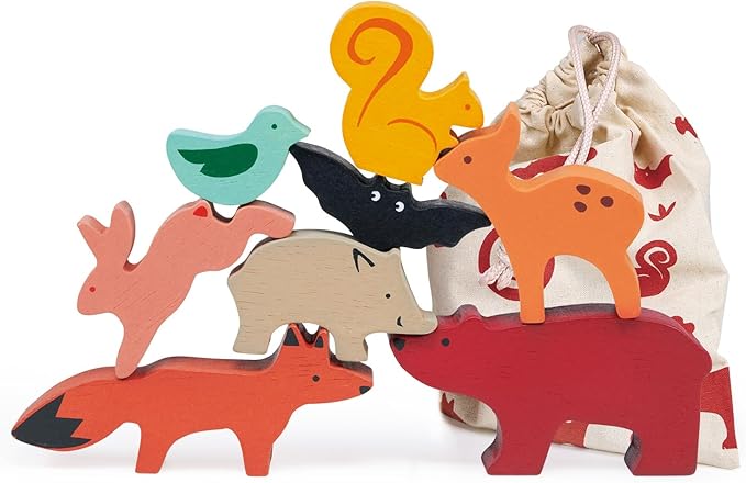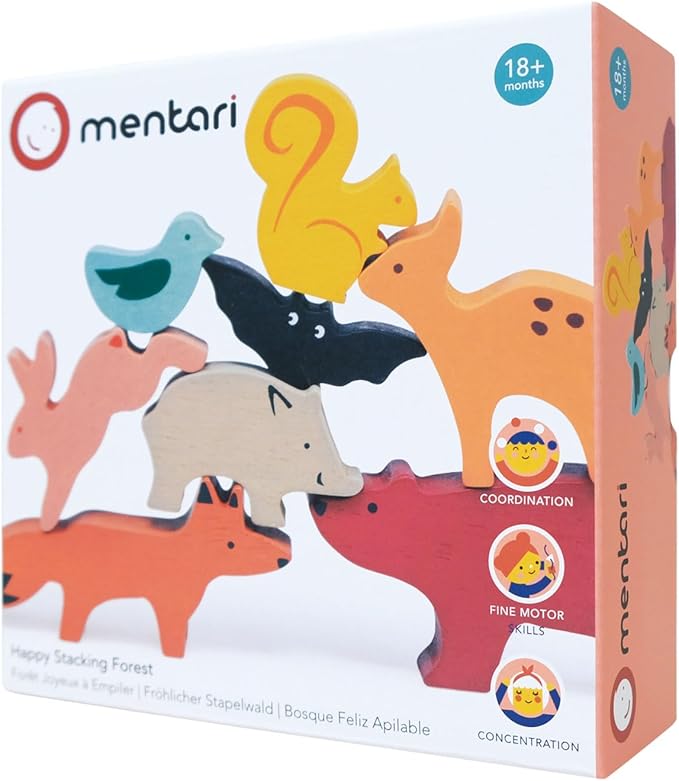 Mentari Toys - Happy Stacking Forest - 8pc Wooden Stacking Toy for Toddlers - Colorful Nature Theme Balancing Activity Toy with Bag - Boost Fine Motor Skills and Dexterity - Educational Toy - Age 18m+