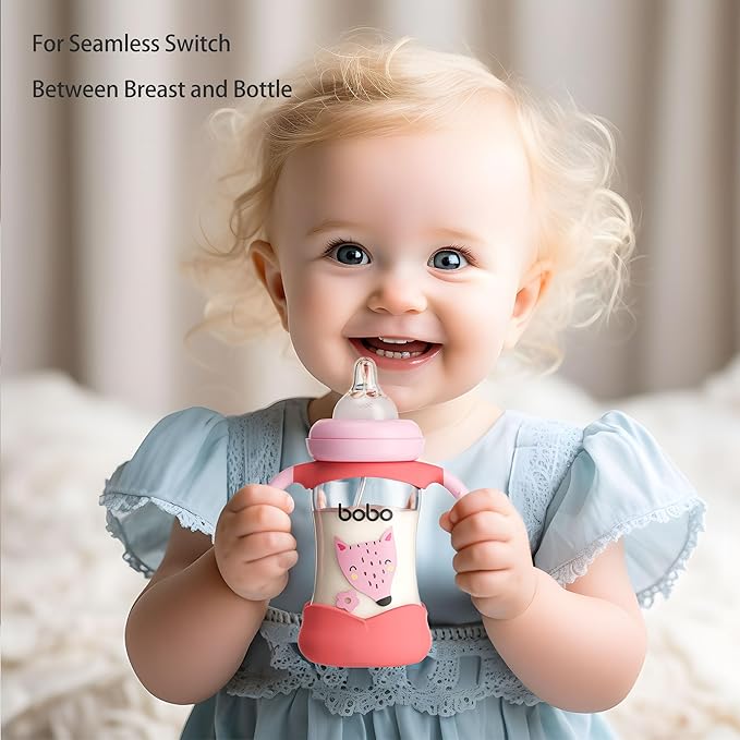 - 160ML/5.4OZ for 9 months +, 260ML/8.8OZ for 12 months +. BPA-free. Meet the needs of all stages of the baby. Glass natural baby bottles with natural response nipples can control the speed of milk according to the baby suction, just like the natural sensation of breastfeeding.